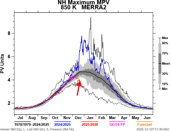 In relazione a questo Dicembre, è doveroso notare un altro importante parametro che riguarda le MPV( Maximum Potential Vorticity). È infatti uno degli strumenti diagnostici più importanti per l'analisi della circolazione atmosferica, specialmente nella Stratosfera.