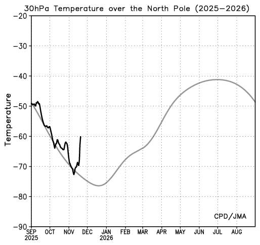 Questo grafico del "Tokyo Climate Center" rappresenta le temperature alla quota dei 30hPa e non possiamo fare a meno di notare l'incredibile riscaldamento che si sta verificando a tale quota, soprattutto se confrontata con gli incipienti raffreddamenti della Stratosfera che generalmente sperimentavamo negli anni passati in questa fase stagionale: