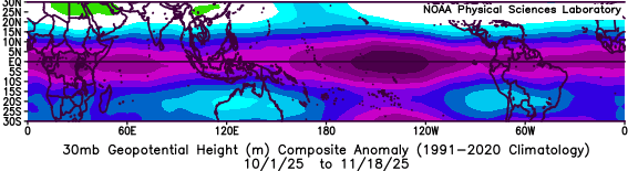 Una tale dinamica è innescata principalmente dalla forte attività della Brewer e Dobson circulation di cui avevamo discusso ad inizio Autunno e dalla presenza di una Nina debole, con una convezione equatoriale traslata nell'Oceano Pacifico Occidentale: