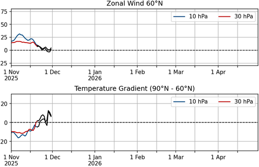 Già in autunno (Ottobre-Novembre 2025) sono stati osservati segnali di un indebolimento anomalo e precoce del VP stratosferico che i modelli prevedono possa continuare, aumentando le possibilità di una dislocazione o di uno split del vortice stesso.