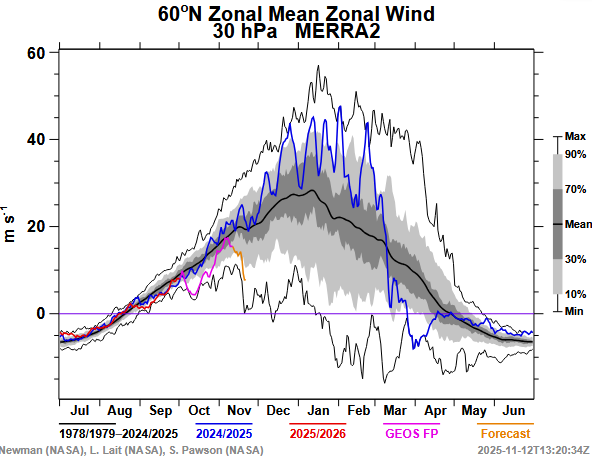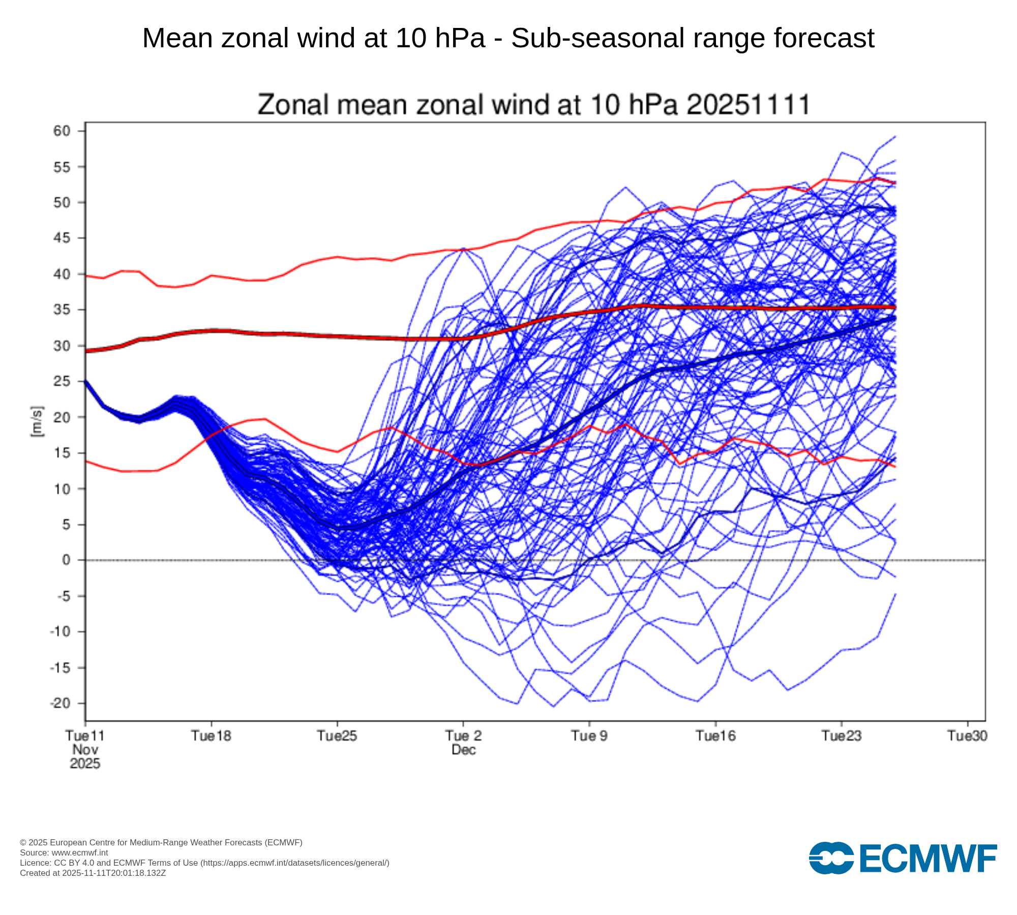 Infine, il grafico delle velocità zonali by ECMWF, rappresenta un nuovo incremento delle ZW nel corso del mese di Dicembre, a sottolineare una  graduale  risoluzione del disturbo ed un VPS in progressivo approfondimento:
