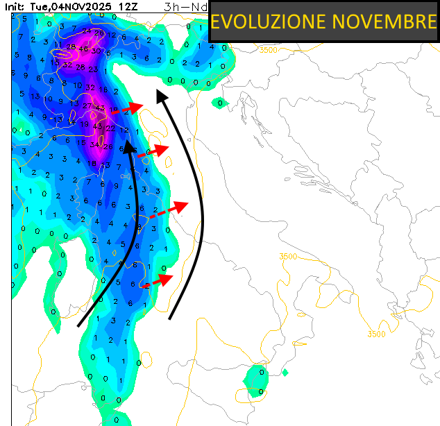 La Proiezione di Novembre del nostro Centro di Calcolo prevedeva un'anomalia negativa di Geopotenziale centrata sull'Europa occidentale: Fig: Proiezione mese di Novembre by CSCT Nel corso della settimana, avremo un progressivo abbassamento del getto in direzione del Mediterraneo Occidentale: fig: Mappa di previsione centrata per Mercoledi 5 Novembre Nel corso del mese tale schema dovrebbe prendere lentamente il sopravvento, fino ad una possibile divergenza del getto con l'instaurazione di un sistema Depressionario con caratteristiche di stazionarietà: fig:Mappa delle Anomalie centrata per Mercoledi 12 Novembre SITUAZIONE DI PERICOLO? Questo pattern molto in linea con quanto previsto, getterebbe le basi per forti precipitazioni sul Mediterraneo Occidentale, anche PERSISTENTI a causa dell'Anticiclone di blocco ad Est: Quindi non fatevi ingannare da questo inizio "asciutto", la situazione potrebbe virare in maniera decisa specie nel corso della 2^ decade del mese. Staff CSCT