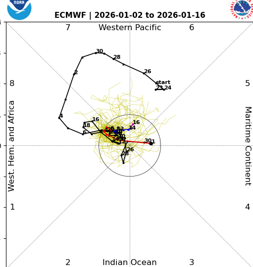 In questo scenario, la MJO (Madden-Julian Oscillation) risulta estremamente debole o confinata nel cerchio neutro: