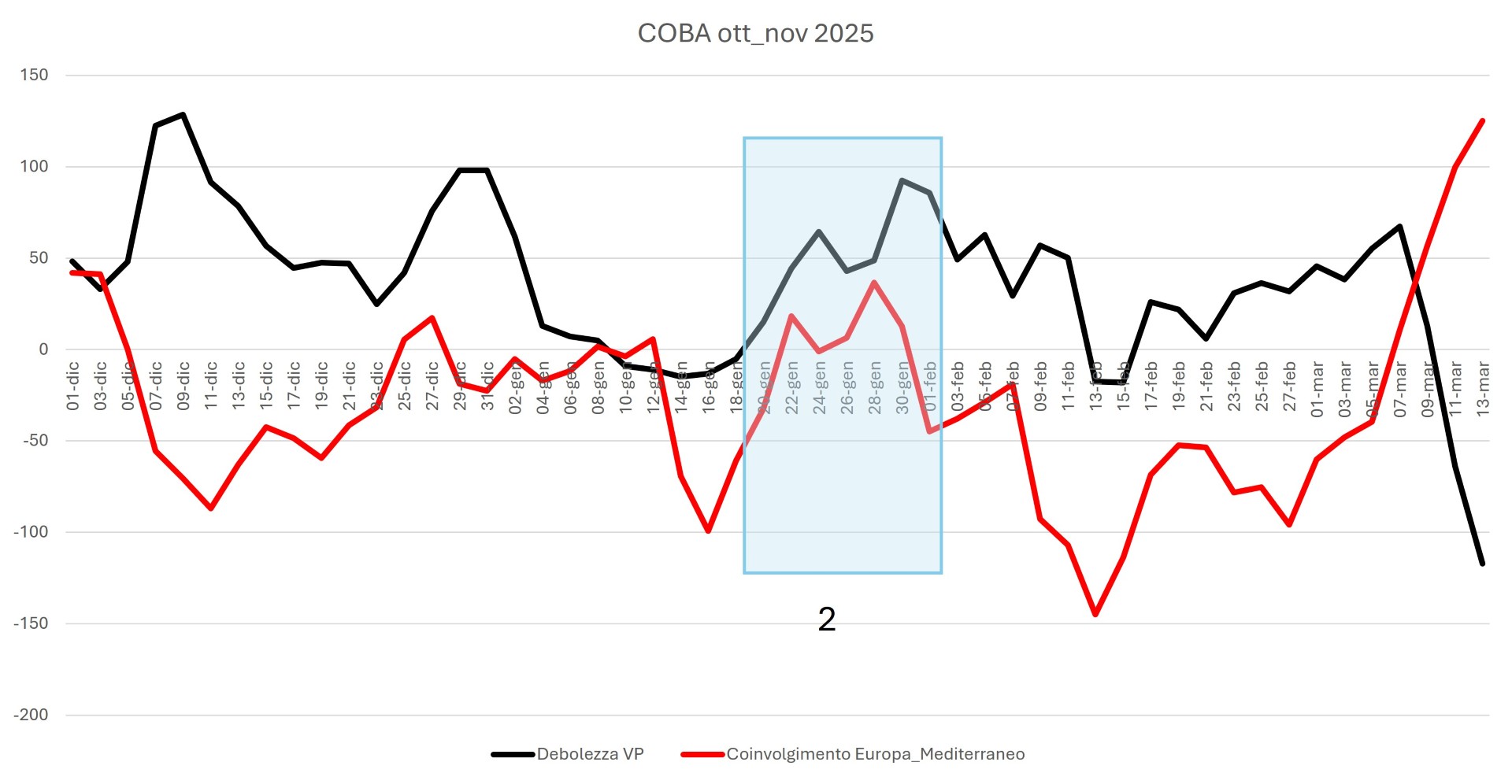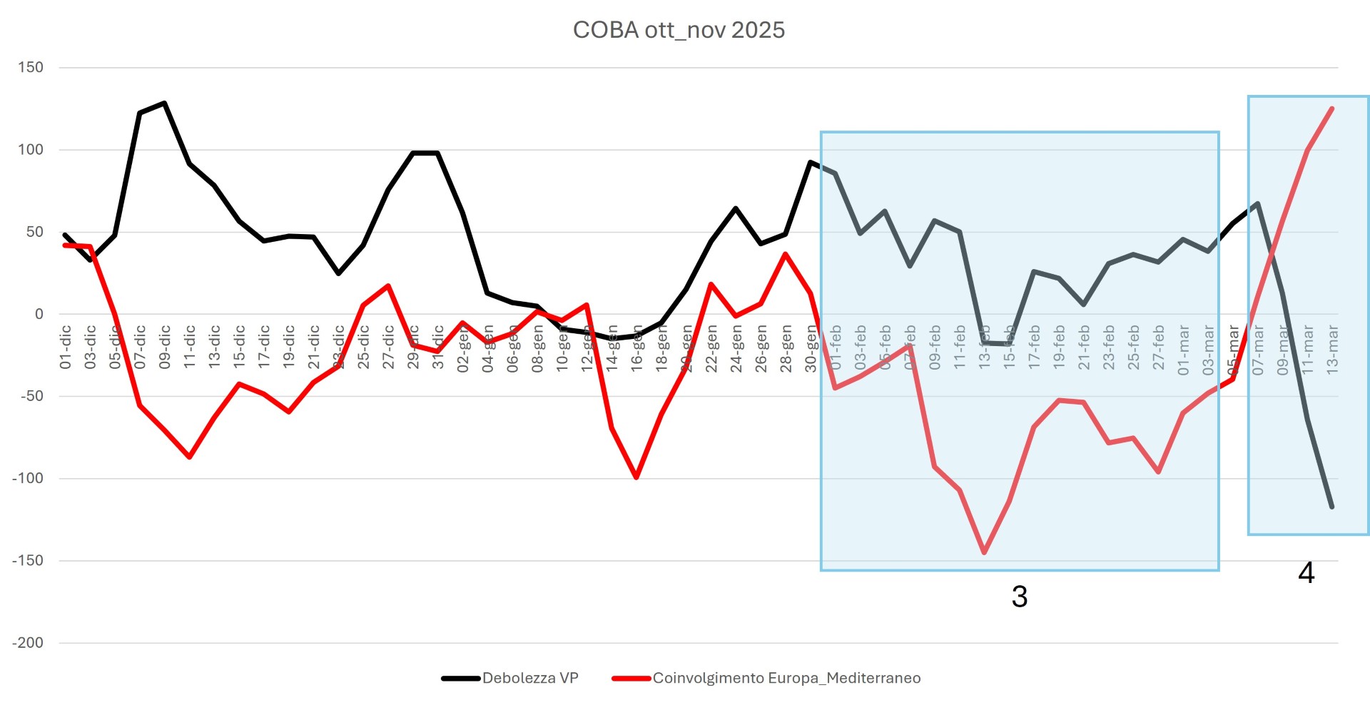Nella figura 1 si evidenzia una prima lunga fase (1) caratterizzata da debolezza del VP accentuata ma da scarso coinvolgimento del Mediterraneo.