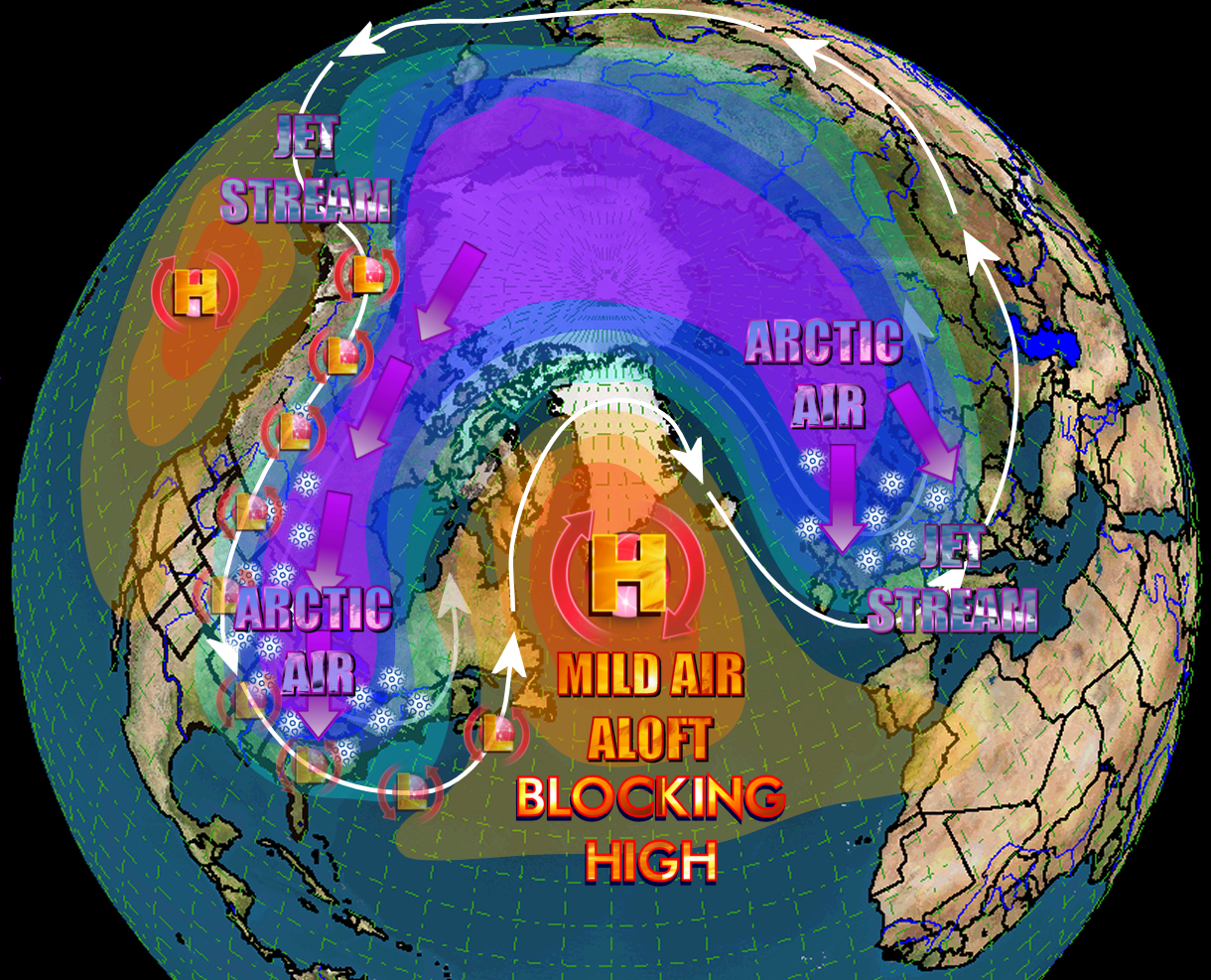 Quando il meccanismo funziona (ovvero quando il getto atlantico non è troppo violento),si forma un'Alta Pressione stazionaria in Atlantico e l 'aria Artica scivola lungo il bordo orientale del blocco.