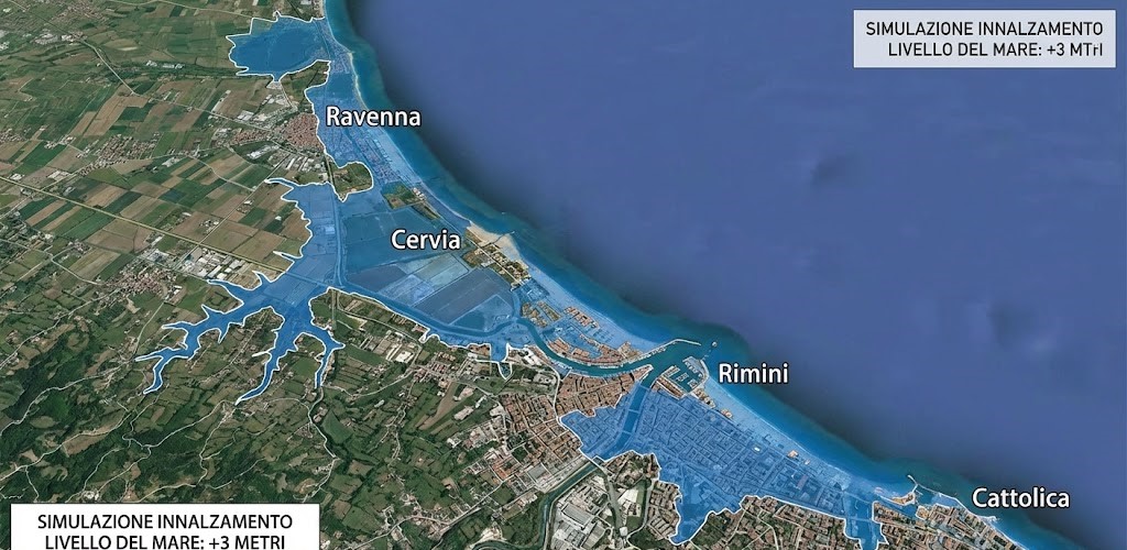 Img: Simulazione innalzamento dei mari su costa Romagnola