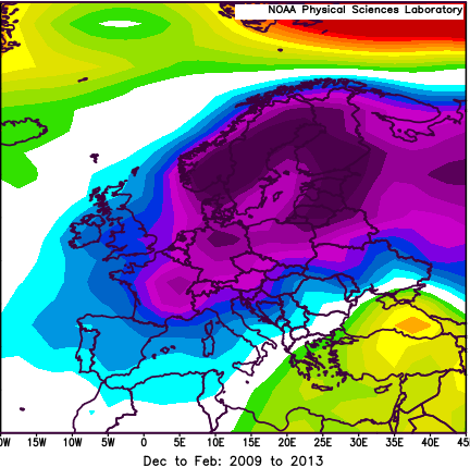 Img: Anomalie di Temperatura in Europa con PDO negativa (Inverni 2009/3013)