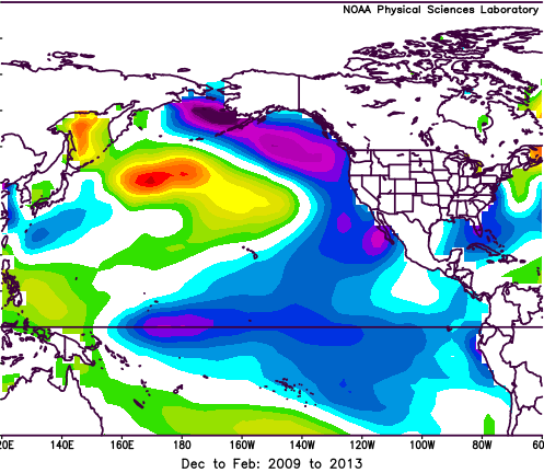 Img: PDO del periodo 2009/2013, notare la differenza con l'attuale PDO che presenta valori matematici ancora più negativi